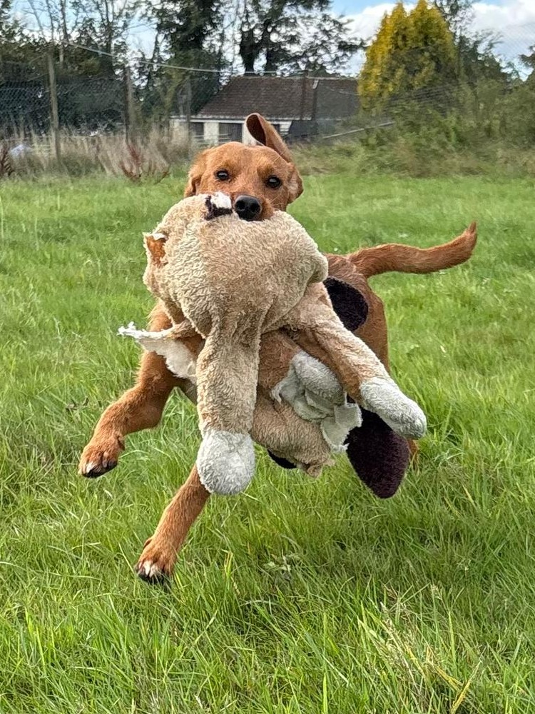 Alfie is the most confident puppy in his group. He loves the people he has met so far and he is a typical playful and mischievous boy. He has been great with the dogs at the kennels. Alfie really loves toys and spends all of his time outside running back and forward with his toys and chucking them around.