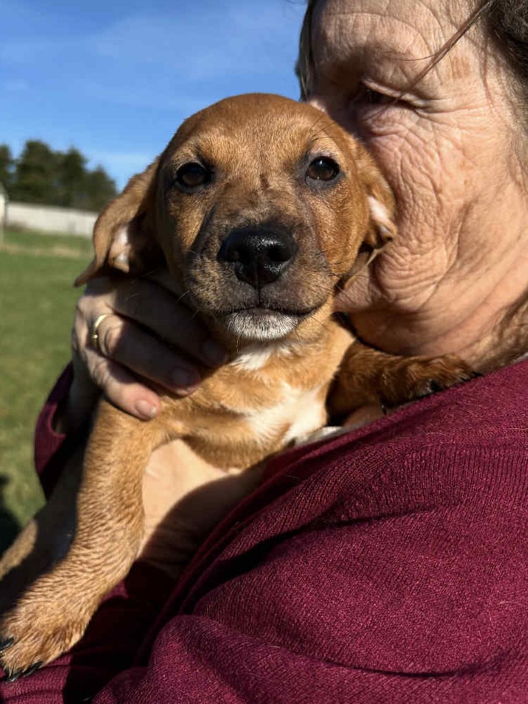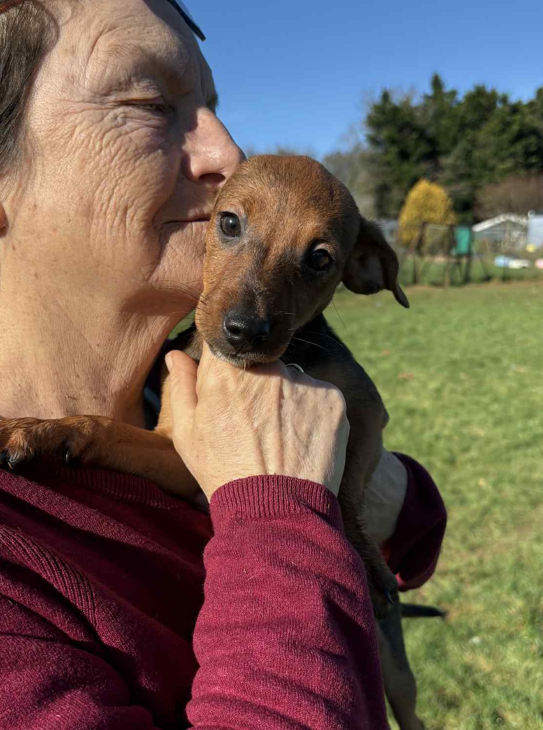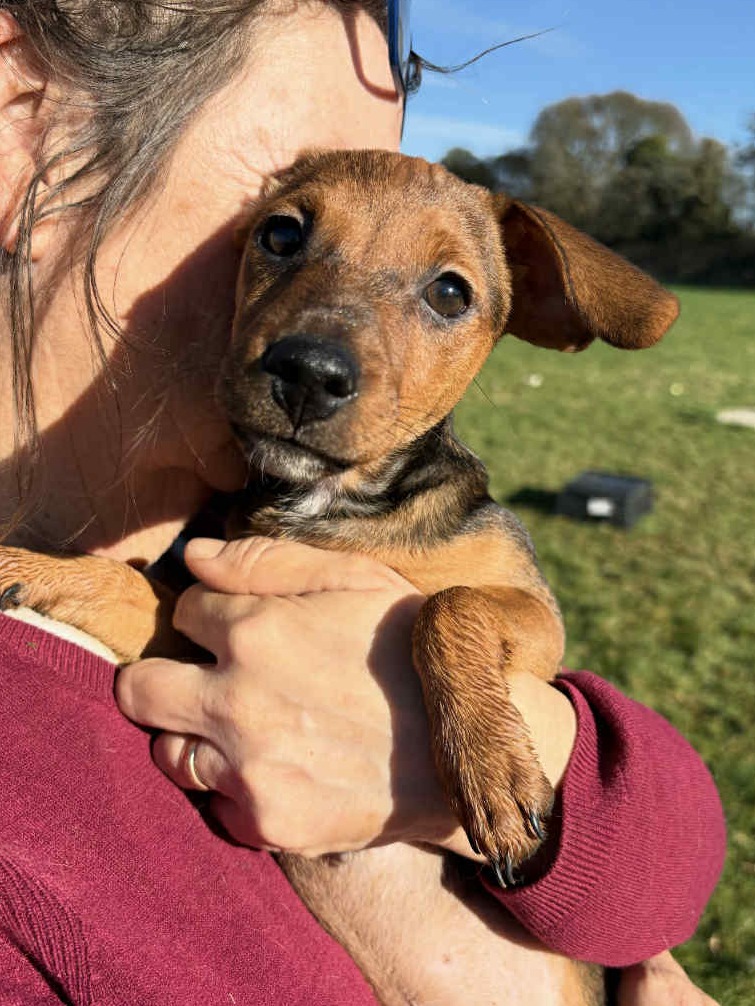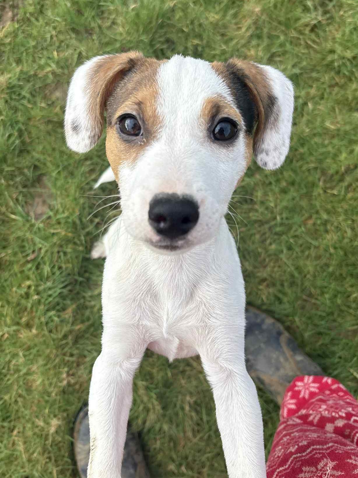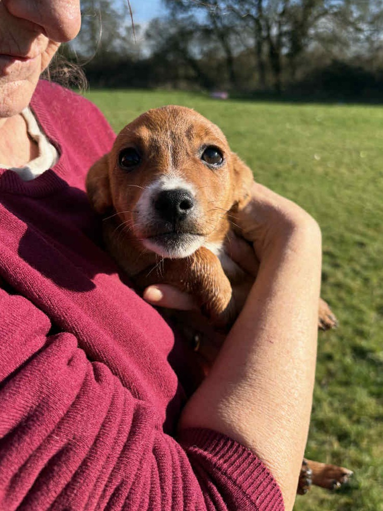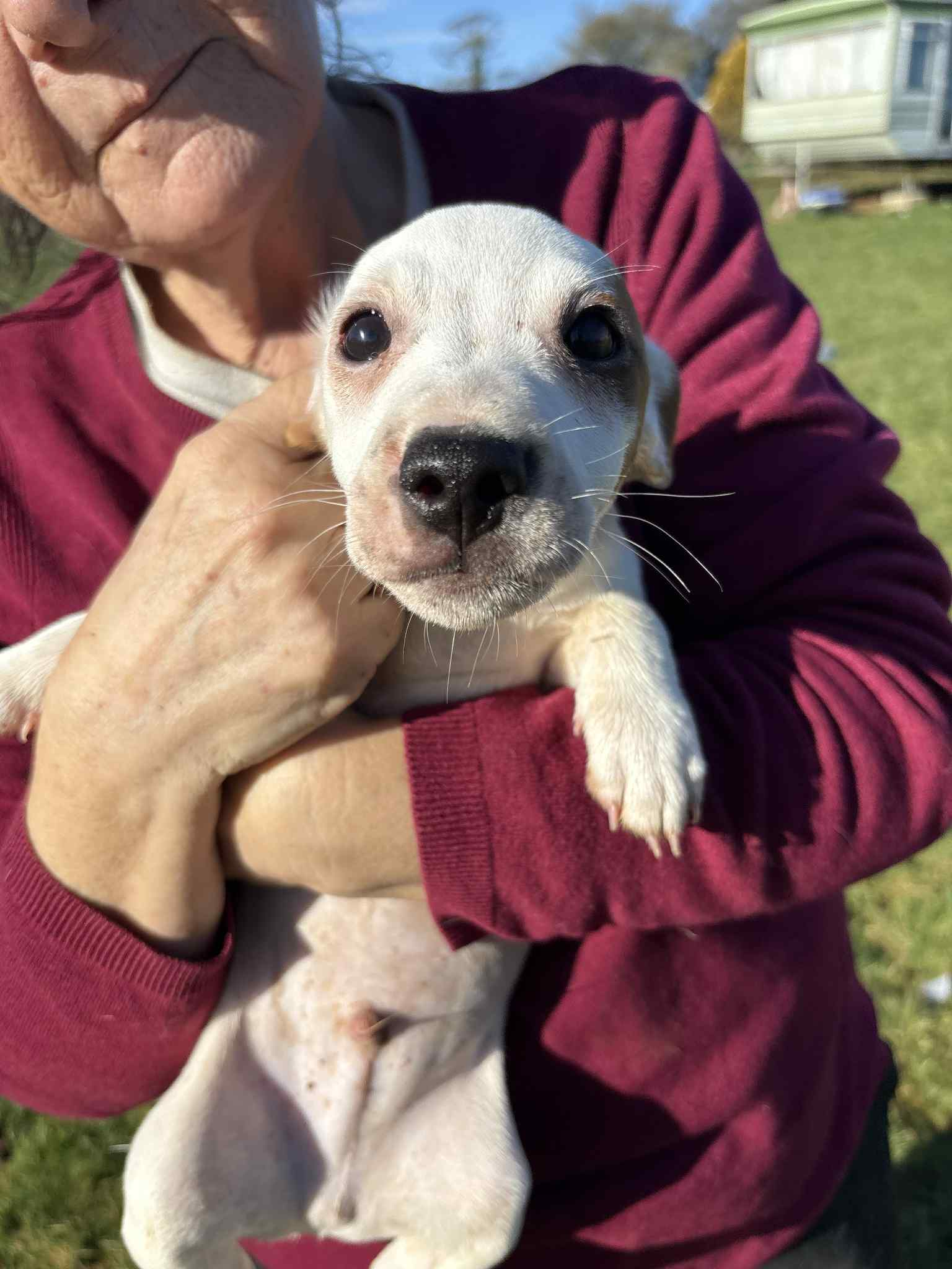This family were born at the rescue centre with us when we rescued their Mum Peaches from a pound only to find out she was pregnant! Peaches had 7 healthy babies on October 31st 2025 and they are now ready for homes of their own. We do not know who their Dad is so the vet estimated that they could grow to be spaniel size. We have two boys, Otter and Goose and five girls, Bunny, Duckie, Monkey, Dove and Mouse. Their Mum Peaches is a loving, affectionate and lively Jack Russell and the pups are very like her in personality. They are all high energy terrier mixes who will need lots of mental and physical stimulation and full training upon adoption.